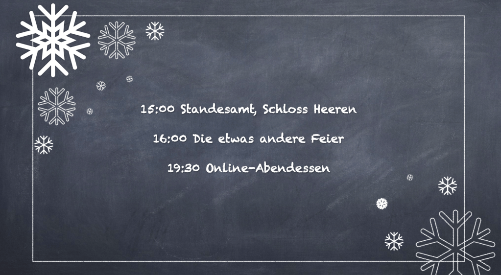 Alle, die eine Einladung bekommen haben, sind herzlich dazu eingeladen an einer etwas anderen Feier teilzunehmen. Die bisherige Planung (Stand 10.01.2021) sieht vor, dass wir eine (fast) kontaktlose Feier organisieren, d. h. es wird eine Outdoor-Feier geben, die es ermöglicht die Familien, die wir eingeladen haben, einzeln mit verschiedenen Aktionen zu überraschen. Diese Überraschungen werden an der frischen Luft, mit Abstand stattfinden und jede Familie wird auf max. eine weitere Person (Braut oder Bräutigam) treffen. Sobald wir final klären können was wie erlaubt sein wird, werden wir euch euer persönliches Zeitfenster und den genauen Standort (im Kreis Unna) mitteilen.